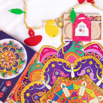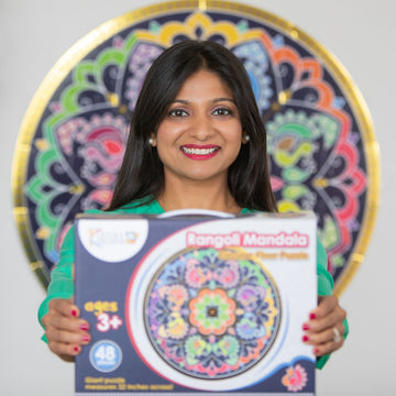 Kulture Khazana, founded by mom and cultural educator Akruti Babaria. When Akruti couldn’t find fun, meaningful ways to share Indian festivals with her kids, she created them. From solving a vibrant Rangoli puzzle to painting festive coasters and crafting sand art, each product brings traditions to life through play and joy.