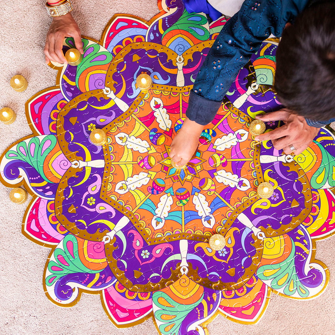Our HUGE Rangoli Mandala Puzzles are almost 3 feet across. These vibrant mirror-like and gold-foiled puzzles are fun to put together and become the centerpiece for decorations