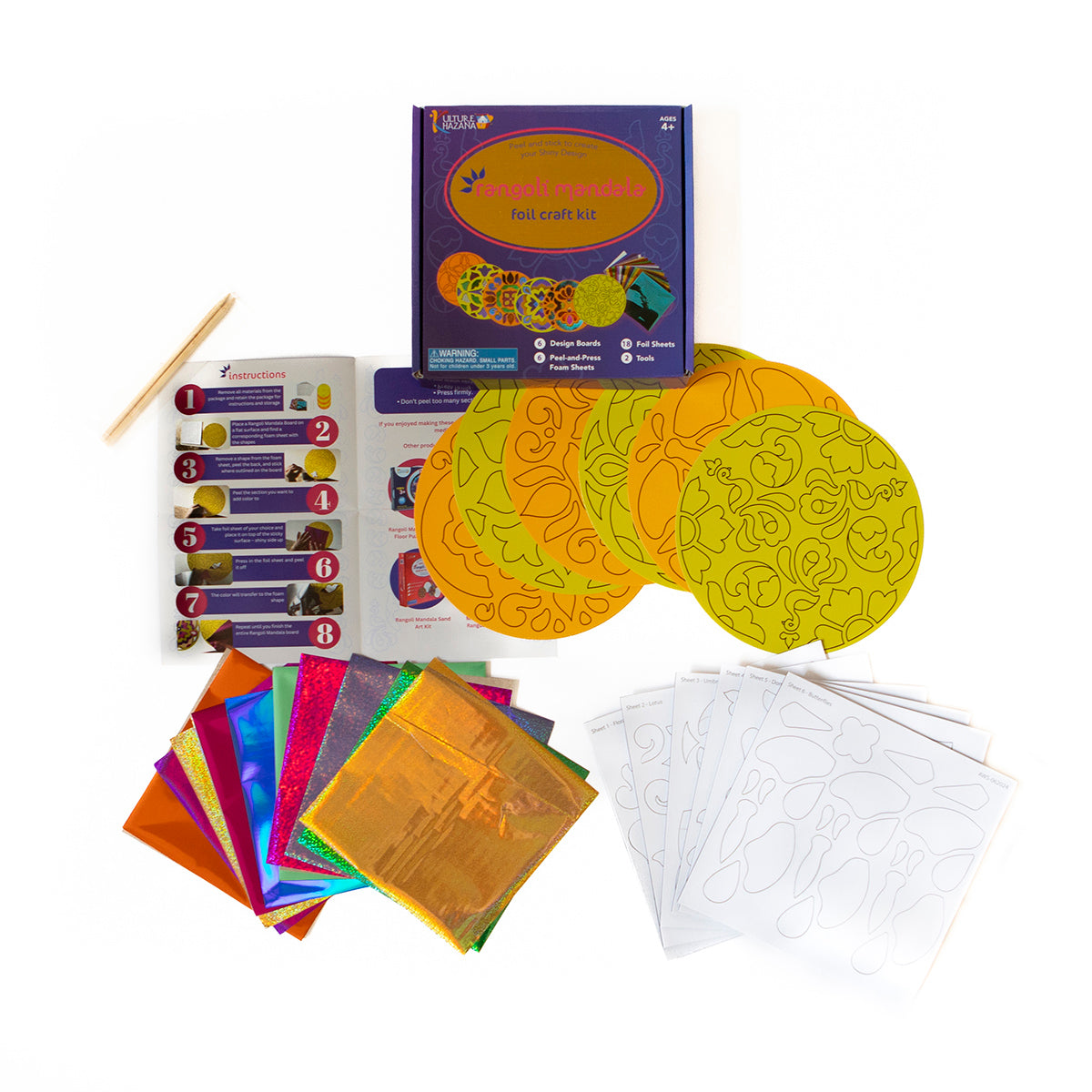 Foil Craft Kit Rangoli Mandala by Kulture Khazana is a fun DIY craft kit perfect for kids ages 4 and up. This shiny, easy peel-and-press engaging craft offers a mess-free way to create beautiful Rangoli Mandala foil designs. The kit includes 6 design boards and 6 foam sheets, each with corresponding unique shapes, 18 shiny and sparkly foil sheets, and to bring your designs to life using the two specialized tools and easy-to-follow instructions.