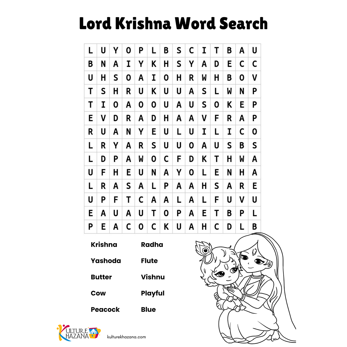 A Fun word search game to share some of Lord Krishna's favorites. It's a great way to solve puzzle, and learn more about little Krishna this Janmashtami.