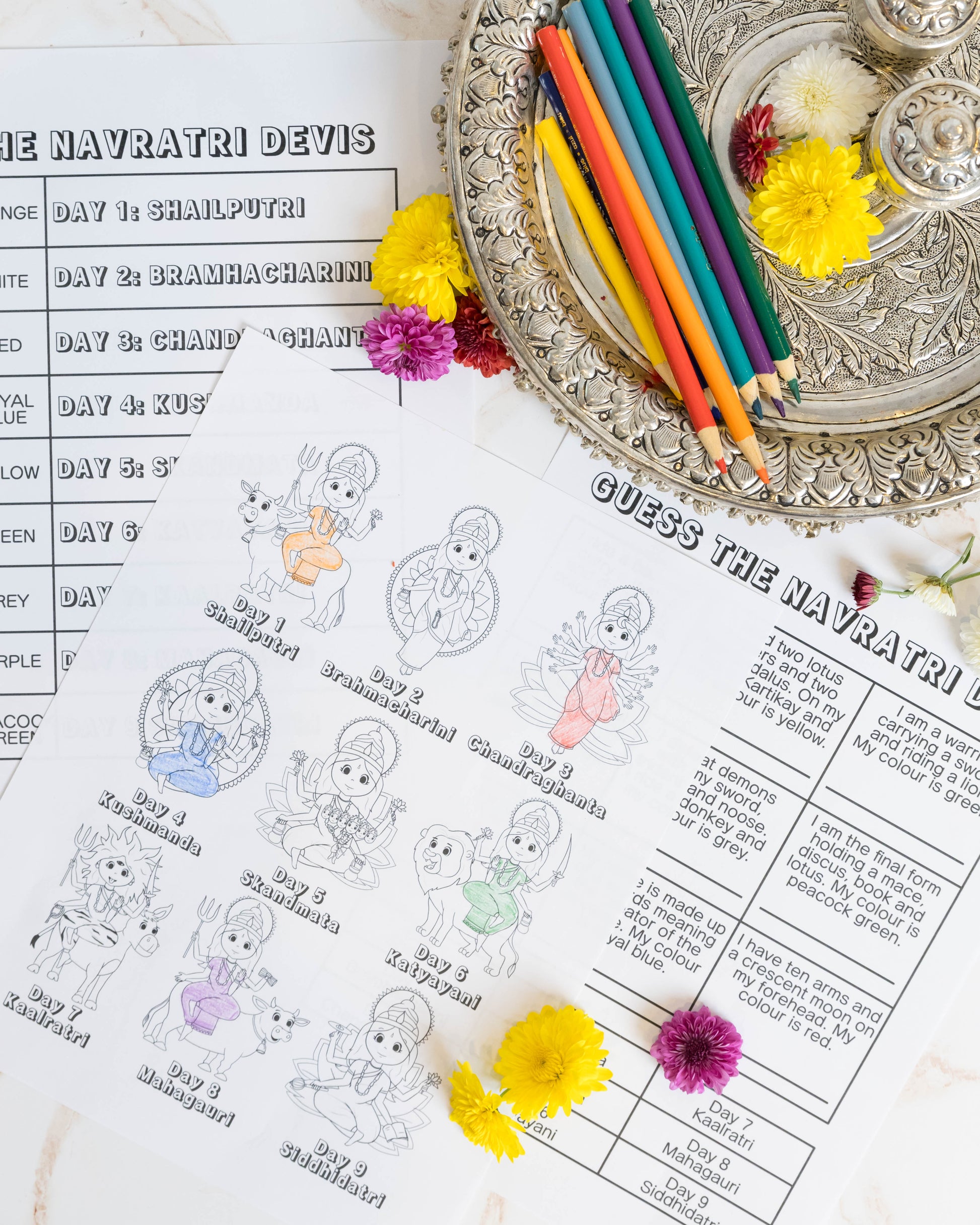 Navratri is a festival that symbolizes the victory of good over evil and celebrates the Hindu goddess Durga. These coloring and activity pages are designed to help kids understand the essence of each Navratri day and the colors associated with it. They can immerse themselves in the cultural significance of Navratri while having a great time.